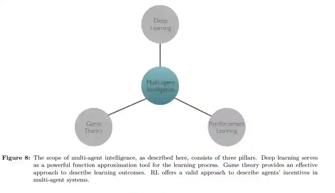 MARL最后一个值得一提的成就是它在扑克游戏《Texas hold ' em》中的应用,这是一种多玩家广泛形式的游戏,玩家可以获得不完整的信息。Heads-up(即两个玩家)无限持有的游戏中有超过6 × 10161种信息状态。直到最近,游戏中才出现了突破性的成就,这多亏了MARL。两个独立的程序,DeepStack (Moravčík等人,2017)和Libratus (Brown & Sandholm, 2018),能够击败专业的人类玩家。最近,Libratus被升级为Pluribus (Brown & Sandholm, 2019年),并表现出非凡的表现,在无限制设置中赢得了5名精英人类专业人士的100多万美元。为了更深入地理解RL和MARL,需要对概念进行数学表示法和解构。在下一节中,我们将提供这些概念的数学公式,从单代理RL开始,逐步发展到多代理RL方法。