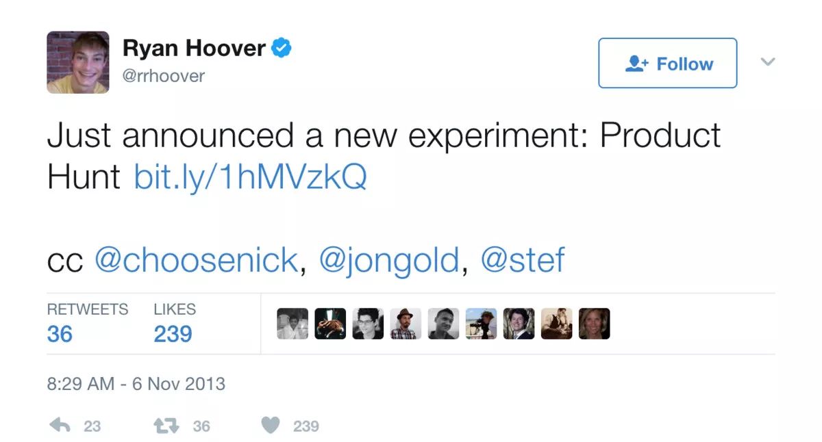 Product Hunt的第一个产品版本是一个链接集合、一个邮件列表,以及一个解释这个项目的博客文章。为了推广这个产品想法,Hoover在Twitter上发了推文: