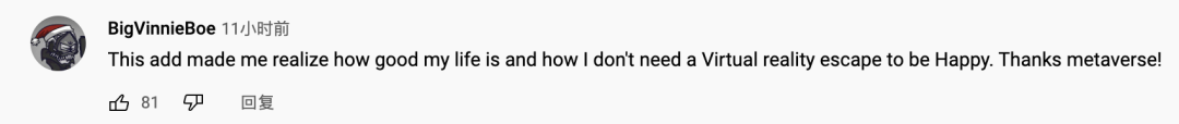 「这则广告让我意识到我的生活是多么美好。我不需要一个可以逃避现实的虚拟世界来获得快乐。谢谢metaverse!」