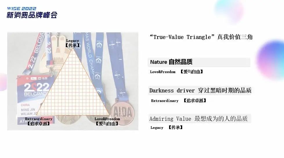 这是真我价值三角模型,非常复杂,可能需要很长时间自我内观探索,我用了两年时间,把这个模型做了简化。它的三角中,一个是“自然品质”,对我来说我找到我的自然品质是“爱与自由”;第二个角是“伴随你度过黑暗时期的最单一的品质”是什么?对我来说是“追求卓越”;最后一个角是“你最想成为人的品质”,对我来说是“传承”。