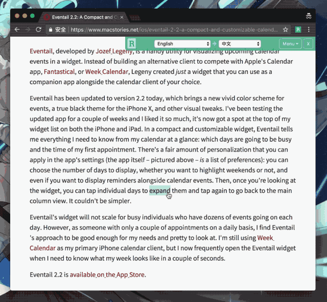 很多时候,我们只是不认识外文网页中的一部分生词,其它大致意思都能看懂。在这种情况下,Readlang Web Reader 或许是你最佳的选择。