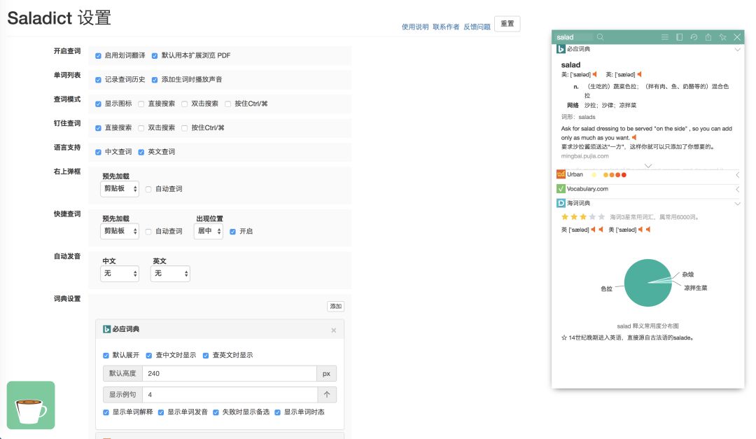 Chrome 上各类划词翻译的扩展可谓数不胜数,而令 Saladict 与众不同的,是其内置了多个查词引擎。只要选中网页内单词后点击右上角的沙拉图标,Saladict 就会为你检索必应词典、海词词典、Urban Dictionary 和 Vocabulary.com 这 4 家的权威释义,助你全方位掌握外文词汇。