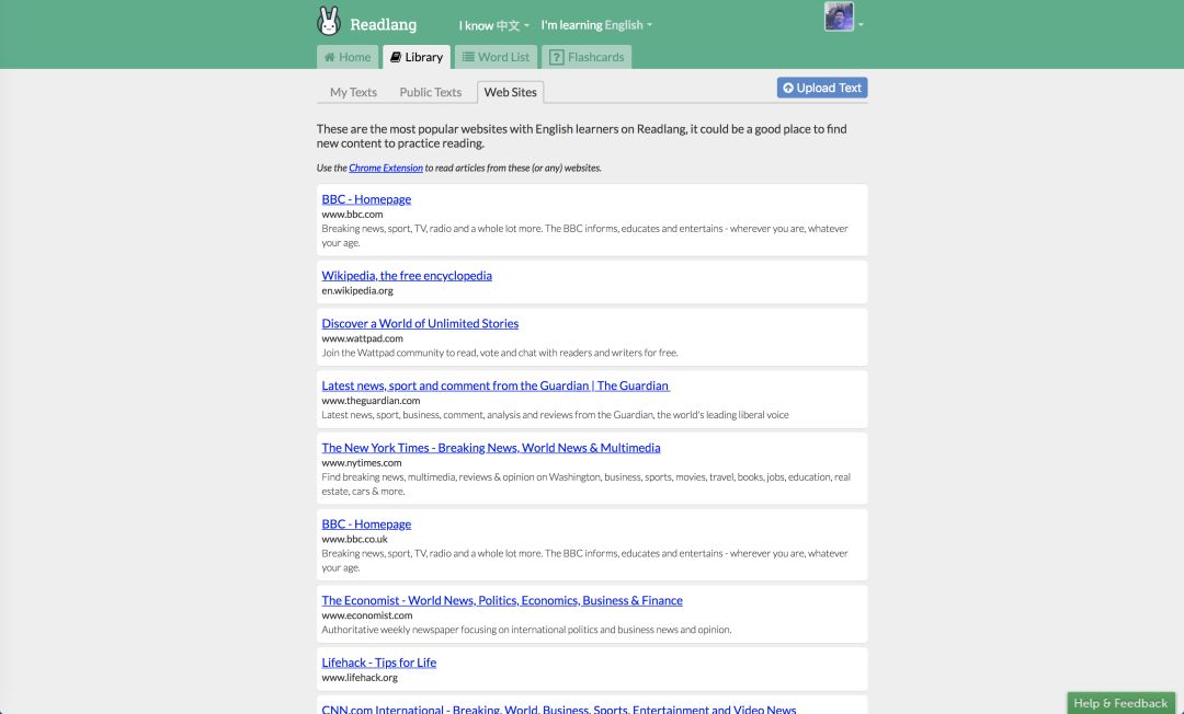 如果你在 Readlang 官网使用该扩展,就会被引导至资料库页面。在这里,你可以查找适合初学者的网站列表、看看其他人都在标注什么,或者管理自己的翻译历史和单词本等。