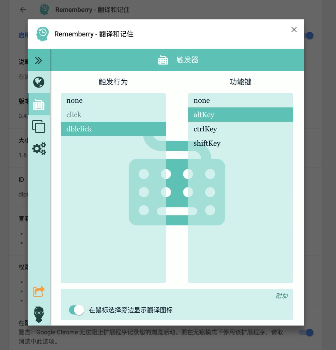 在 Rememberry 的设置中,你还可以自定义触发行为、源语言、单词本等,并借助 Google 账户实现云端同步。