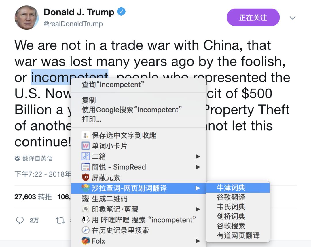 除了划词外,你也可以右键单击不熟悉的单词,然后在牛津、韦氏等权威词典中搜索。当然,直接在 Saladict 的搜索框中输入也是个不错的选择。