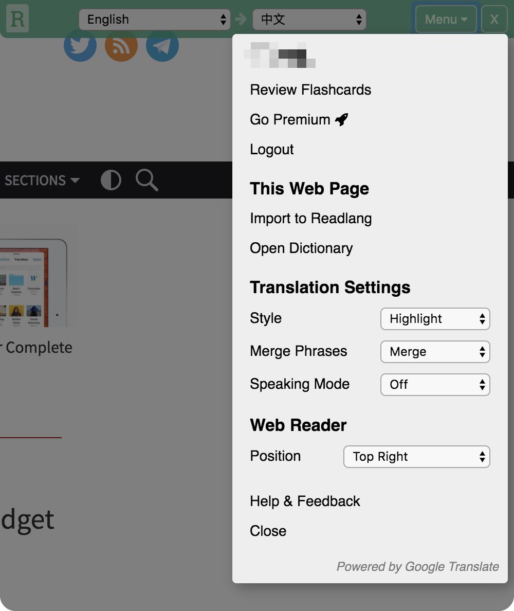 在 Readlang Web Reader 的设置中,你可以选择翻译对象、标注样式等。用 Google 账户登录后,你还可以解锁整句翻译、生词卡等高级功能。