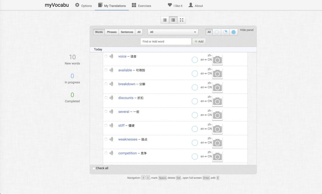 使用扩展一段时间后,你就可以在 My Translations 里集中查阅自己的查词历史,并逐个查看释义、图解,完全掌握后,就可以标记为 Completed 了。