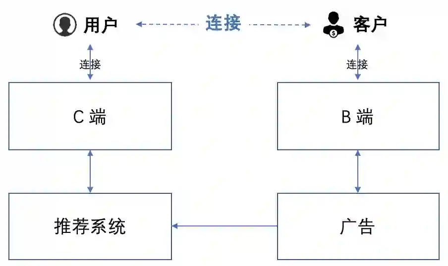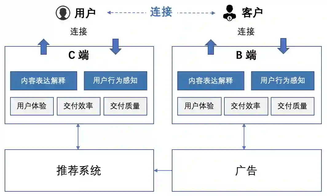 陈敏亮: 流量变现本质是用户与客户的连接,从大前端视角又可以拆分为用户与流量 C 端的连接以及客户与支撑平台 B 端的连接,最终构成用户与客户间的连接。