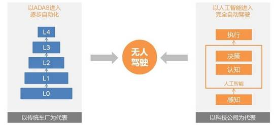 自动驾驶风口来袭,科技公司、初创企业、新兴电动车企、传统车企、一级供应商争相涌入,各显神通。目前主要有两条典型的技术路径:一是以跨界科技企业、初创企业为代表的一步到位型,跨过中间级别,直指L4和L5级无人驾驶,先不考虑成本,等技术方案成熟后成本下降,再大规模商业化。还有一类是以传统车企、Tier1为代表的循序渐进型,它们在可接受的成本内推动辅助驾驶功能的商用化,然后随着ADAS功能的完善和升级,逐渐过渡到无人驾驶。