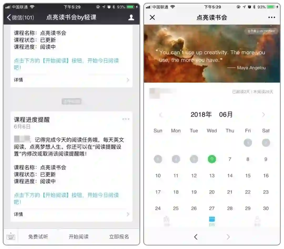 通过微信关注公众号「点亮读书会by轻课」,当天24点之前都可以随时随地学习。你也可以设定自己专属的提醒时间,制定更加个性化的阅读日程!