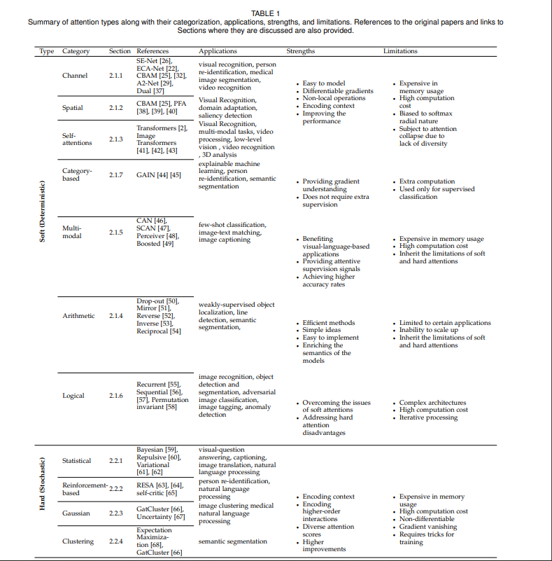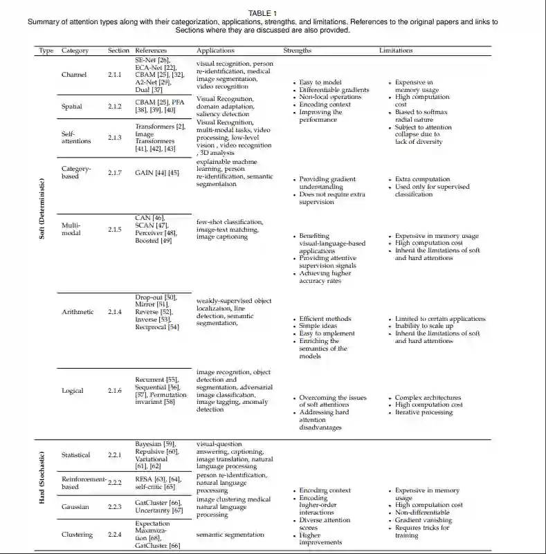 视觉中注意力的主要目的是模仿人类视觉认知系统,关注输入图像中的基本特征[20]。我们根据用于生成注意分数的主要功能对注意方法进行分类,如softmax或sigmoid。表1给出了这个综述类别的总结、应用、优点和局限性。