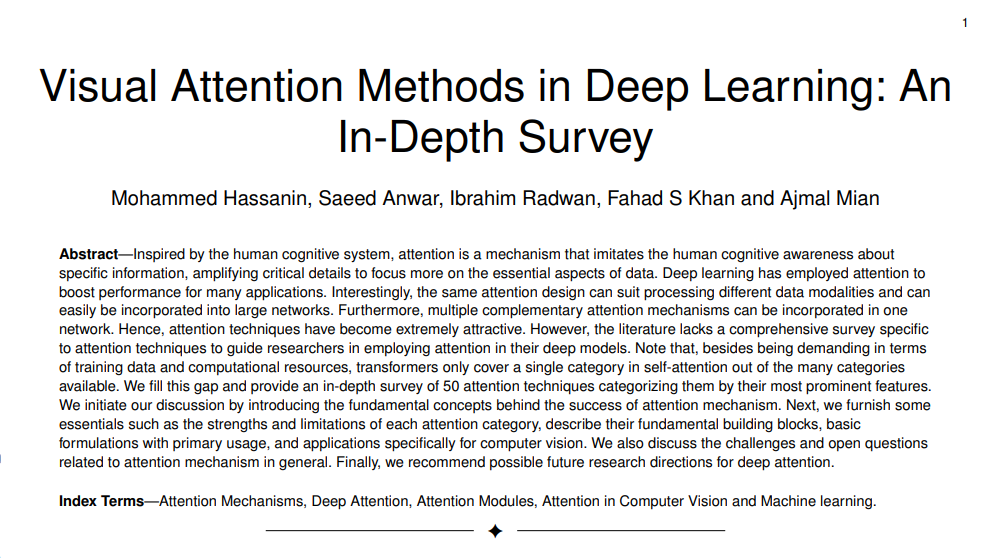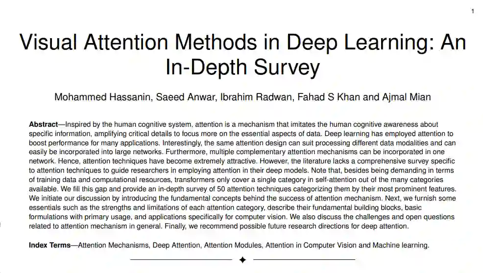 受人类认知系统的启发,注意力是一种模仿人类对特定信息的认知意识的机制,将关键细节放大,从而更多地关注数据的本质方面。深度学习已经在许多应用中运用了注意力来提高性能。有趣的是,同样的注意力设计可以适合处理不同的数据形式,并且可以很容易地并入大型网络。此外,多个互补注意力机制可以整合到一个网络中。因此,注意力技巧变得非常有吸引力。然而,文献缺乏对注意力技术的全面研究,以指导研究者将注意力运用到深度模型中。注意,除了在训练数据和计算资源方面的要求外,Transformers 在自注意力中只覆盖了许多可用类别中的一个类别。我们填补了这一空白,提供了50种注意力技巧的深入综述,并根据它们最突出的特征进行了分类。我们通过介绍成功注意力机制背后的基本概念来开始我们的讨论。接下来,我们提供了一些要素,如每种注意力类别的优势和局限性,描述了它们的基本构建模块,主要用途的基本公式,以及专门用于计算机视觉的应用。在此基础上,对注意力机制所面临的挑战和有待解决的问题进行了综述。最后,我们对未来可能的研究方向提出建议。