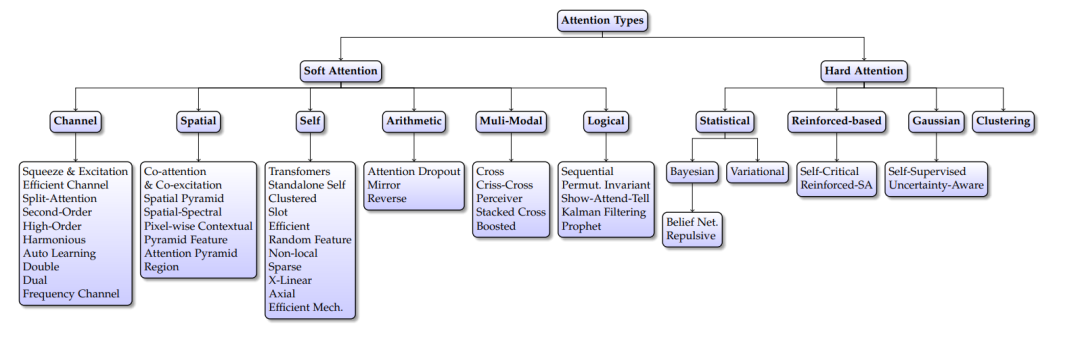 注意力类型的分类。根据注意力的执行方法对注意力进行分类。有些注意力技巧可以适用于多个类别;在这种情况下,注意力是根据最主要的特征和主要应用进行分组的。