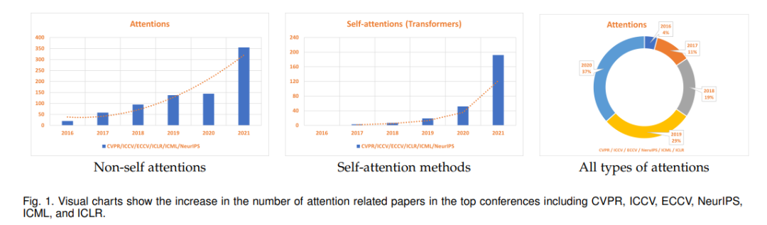 由于transformers 已经在许多视觉应用中使用; 一些综述总结了transformers在计算机视觉中的最新趋势。尽管transformers 提供了很高的精度,但这是以很高的计算复杂度为代价的,这阻碍了其在移动和嵌入式系统应用中的可行性。此外,基于transformers 的模型比CNN需要更多的训练数据,缺乏有效的硬件设计和通用性。根据我们的综述,在被调研的50种不同的注意力类别中,transformers只涵盖了自注意力的一种类别。另一个显著的区别是,我们的调查关注的是注意力类型,而不是基于transformers的调查[17]、[18]所涵盖的应用。