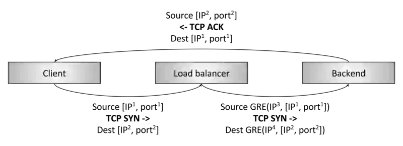 DSR 通常使用通用路由封装(Generic Routing Encapsulation,GRE)来将从负载均衡器发送给后端的 IP 数据包进行封装,而不是使用网络地址转换。因此,当后端收到封装过的数据包后将它解封,然后就知道客户端的原始 IP 地址和 TCP 端口。这就使得后端可以直接向客户端响应了,而不需要经过负载均衡器。