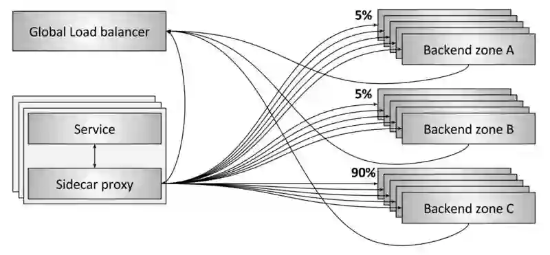 sidecar 代理和后端都定期向全局负载均衡器报告状态。这允许全局负载均衡器根据延迟、成本、负载、当前故障等信息来进行决策。