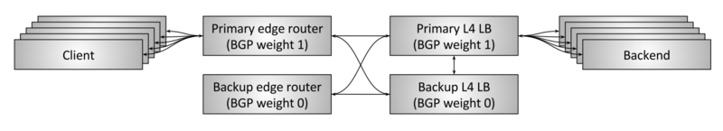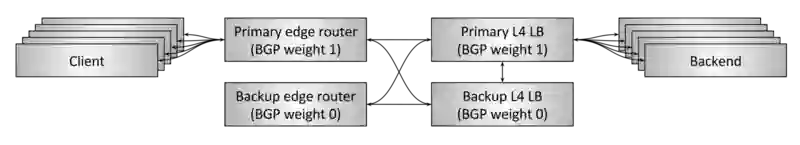 类似地,主 L4 负载均衡器向边缘路由器宣称自己比备份负载均衡器有更高的 BGP 权重,因而它在稳定状态下处理所有流量。