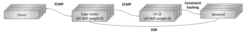 N 个边缘路由器以等量的 BGP 权重声明所有任播虚拟 IP。用等价多路径路由(Equal-cost multi-path routing,ECMP)来确保,在大体上,来自单个 flow 的所有数据包到达相同的边缘路由器。flow 通常是包含源 IP/ 端口和目的 IP/ 端口的 4 元组。(总之,ECMP 是一种在一组使用一致性哈希的等量权重的网络链路上分发数据包的方法)。尽管边缘路由器自身不特别关心哪个数据包到哪里,但是通常来自同一个 flow 的所有数据包通过相同的链路集,通过这样来避免数据包乱序造成的性能下降。