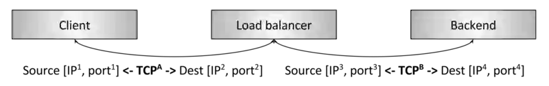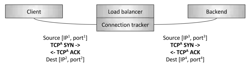 同时使用连接监测和 NAT,负载均衡器可以让大多数原始 TCP 流量直接从客户端到达后端。例如,客户端向1.2.3.4:80发起通信,选中的后端位于10.0.0.2:9000。客户端 TCP 数据包会首先到达负载均衡器所在的1.2.3.4:80。然后,负载均衡器会将目标地址的 IP 和端口改为10.0.0.2:9000。它还会将源地址的 IP 和端口改为负载均衡器的 IP 地址。因此,当在 TCP 连接中响应时,数据包会返回到负载均衡器,然后在这里反向进行连接监测和网络地址转换。