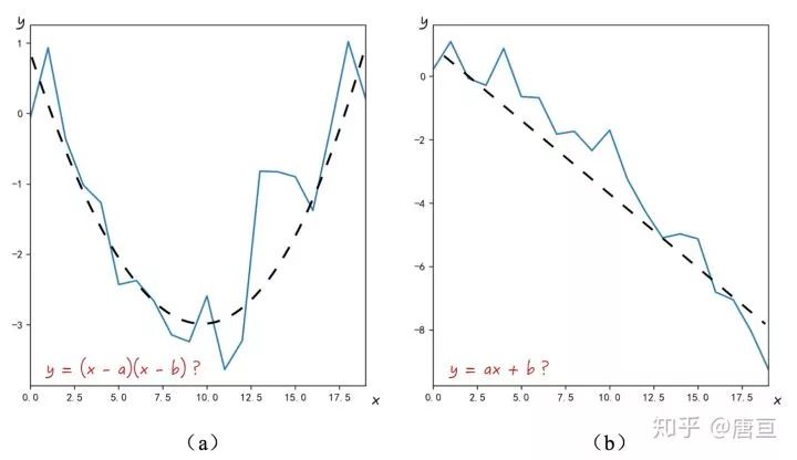 对于图5a,数据的图形有点像抛物线,因此选择二次多项式拟合是一个比较合理的选择。于是假设模型的形式为y=(x-a)(x-b)。然后使用数据去估计模型中的未知参数a,b。得到的结果还不错,模型的预测值与真实值的差异并不大。