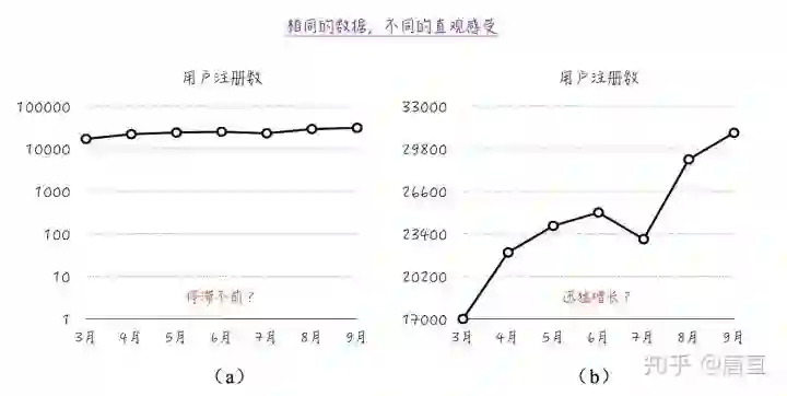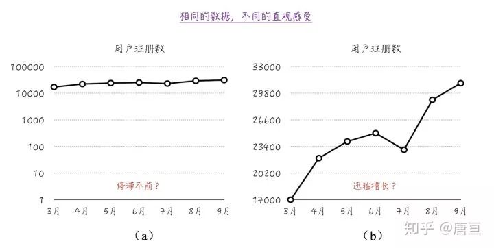 如图4所示,我们将某APP每月的用户注册数表示在图中。图4a给人的直观印象是每月的安装数是大致差不多的,没有明显的增长。而图4b给人不同的印象,从3月份开始,用户注册数大幅度增长。但其实两幅图的数据是一模一样的,给人不同的感觉是因为图4a中纵轴的起点是0,而且使用了对数尺度;而图4b的纵轴是从17000开始的,而且使用的是线性尺度。