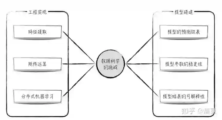 在数据科学实践中,我们将使用较为复杂的机器学习或统计模型对数据做精细化的分析和预测。这在工程实现和模型搭建两方面都提出了挑战,如图2所示。
