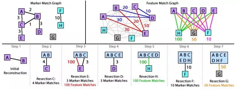 图2 左上角的图表将图像描述为字母框,框边表示图像对之间匹配的标记的数量。上面的中图和右上角的图描述了图像之间的公共特征匹配的数量。下图描述了基于两条规则的图像A到G的定向顺序:(1)添加与重构匹配标记最多的图像;(2)使用最多多特征匹配打破关系。