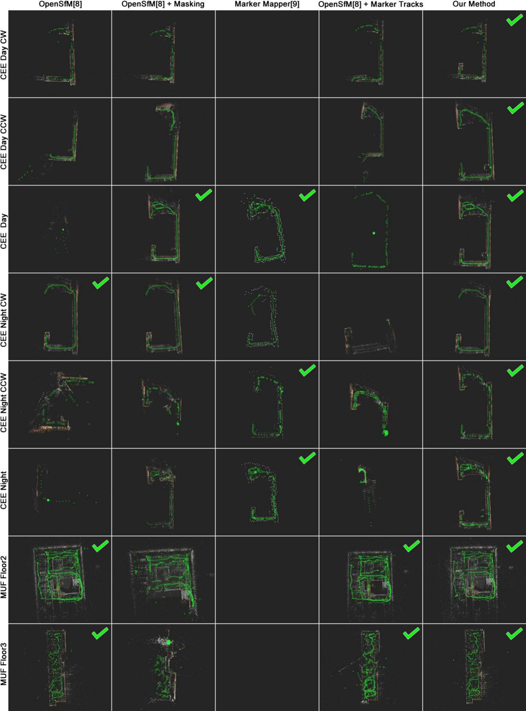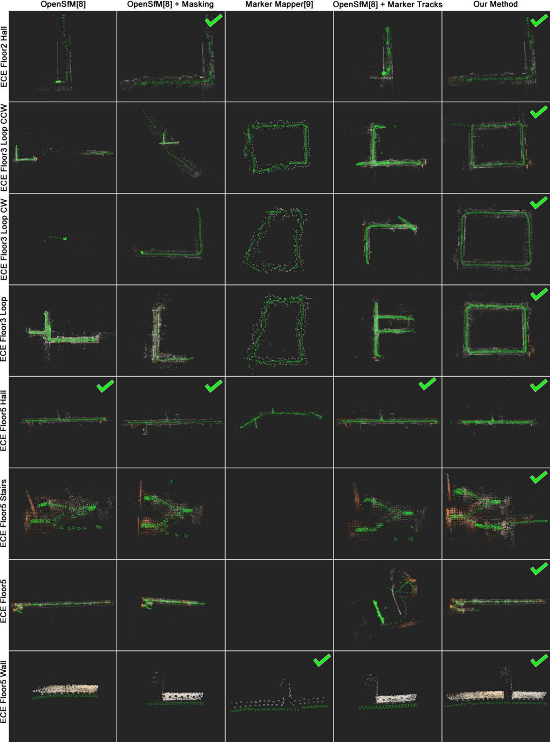 图5 OpenSfM, OpenSfM与标记,MarkerMapper, OpenSfM与标记和特征,和我们的方法对ECE影像重建结果。使用标记作为结构通常会产生较差的结果(例如ECE Floor2 Hall, ECE Floor3 Loop CW, ECE Floor3 Loop, ECE Floor5 Stairs)。我们的方法对于所有的图像集合都能产生和其他方法一样好的或者更好的完整的重建。最好的结果用绿色的复选标记表示。