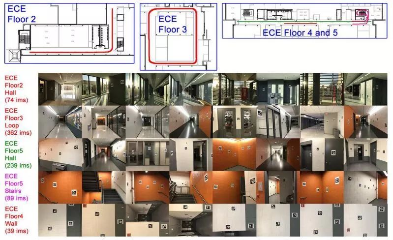 图3 上面的图表是ECE的平面图。图像收集的路径以红色、绿色和洋红色叠加。这些颜色对应于图像集名称和示例图像。例如,ECE Floor5楼梯在ECE Floor4和5平面图中以品红线条显示,带有示例图像的名称也为品红。