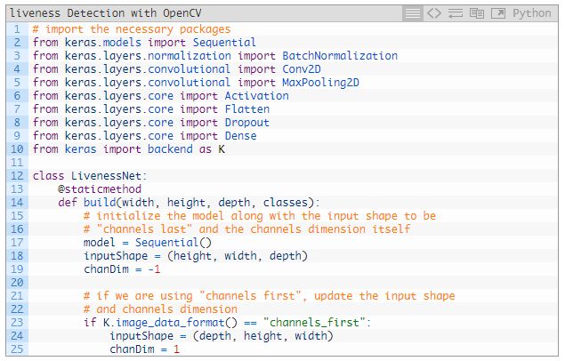 在构建数据集之后,我们实现了「LivenessNet」,它集成了 Keras 和深度学习 CNN。