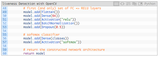 在 79~83 行中建立并编译了我们的 LivenessNet 模型。