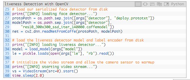34 和 35 行加载序列化的预训练模型(LivenessNet)和标签编码器。