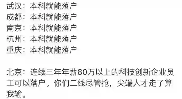 除此之外,这次抢人政策会对互联网行业 IT 码农有一定程度利好。《管理方法》规定,在本市行政区域内的高新技术企业、创新型总部企业、新型研发机构等科技创新主体中承担重要工作,近 3 年每年应税收入超过上一年度全市职工平均工资一定倍数的(企业注册在城六区和北京经济技术开发区的 8 倍,注册在本市其他区域的 6 倍),符合人才引进计划。