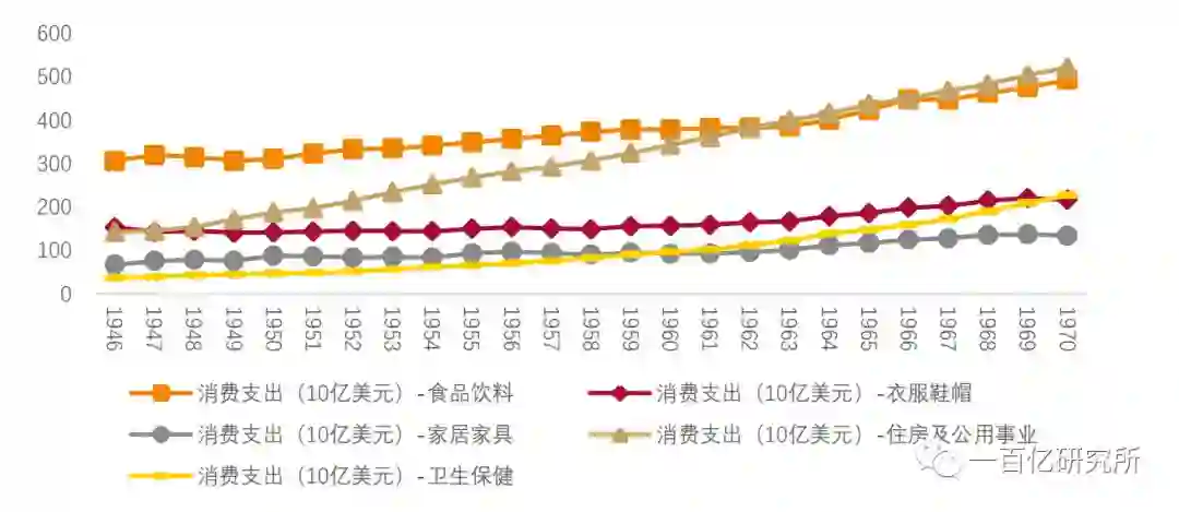 1946-1970 年,在上述消费人口基数扩大、居民消费水平普遍提升两个因素驱动下,加之战后人们对于美好生活的强烈向往,美国经历了较长一段时间的大众消费繁荣,个人消费支出总量复合增速 3.8%(剔除通胀影响)。