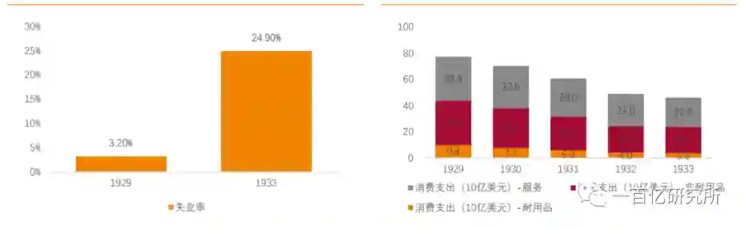 1929-1933 年为大萧条时期,1929 年货币政策的收紧致使股市暴跌、银行爆发破产危机、信用收缩。消费信贷的减少使得消费需求,尤其是耐用品消费需求骤减,供给端总产出相应减少,工厂爆发“裁员热”,失业率从 1929 年的 3.2%飙升至 1933 年的 24.9%,致人均可支配收入下滑, 进一步降低消费需求,形成恶性循环。