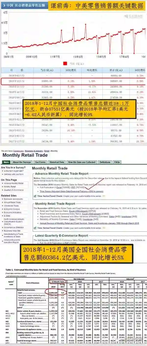 2018年美国GDP约为18万亿美元,是中国的约1.5倍。然而中国消费占GDP比例超过三分之一,高达44.32%,是美国的1.5倍。2018年中国社会消费零售总额这一重要数据达到38亿人民币,距离超越美国数据只差一点,2019中国预计超过40万亿,很大可能超过美国。