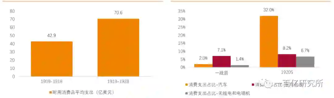 工业经济发展使得可供消费商品种类、数量提升,“收入上涨”+“消费信贷”驱动购买力上升,“能买到”+“有能力买”共同催动耐用消费品消费热潮,汽车、无线电、家用电器等耐用品消费量大涨。