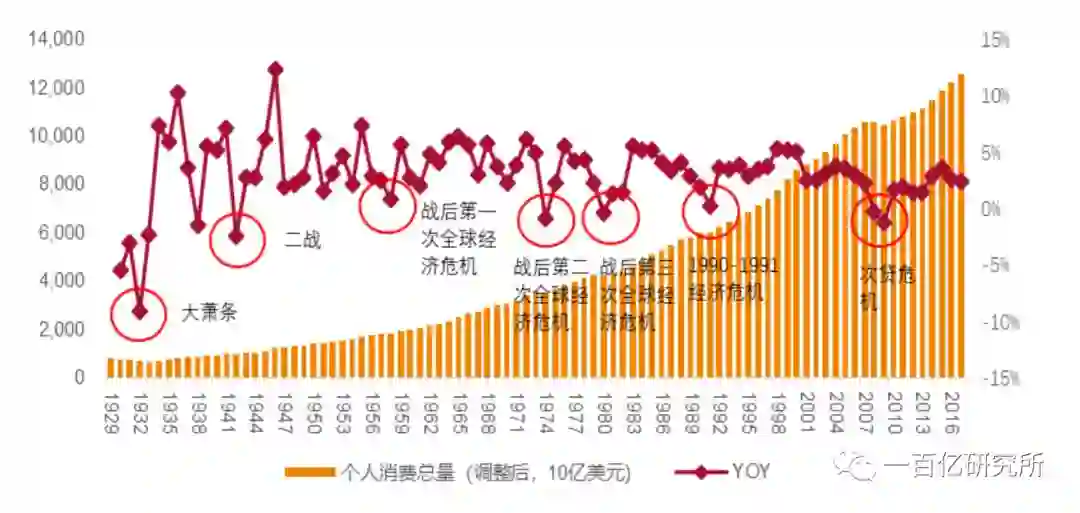 纵观美国自 1929 年-2017 年近 90 年消费史可以看到:美国剔除通胀因素后的个人消费总量整体稳步提升,近四十年增速基本稳定在 6%以下。消费支出受全球经济危机等宏观因素影响较为明显,在几次严重经济危机期间增速为负,但在经济危机结束后恢复速度也较快,极少出现连续两年及以上负增长的情况,可见整体消费能力非常强劲。