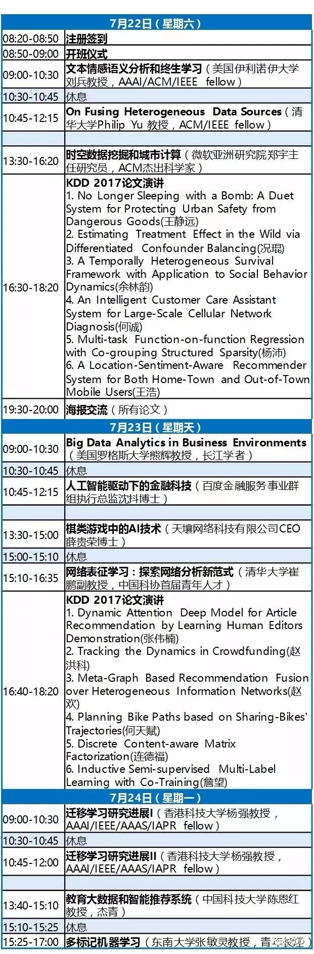 简介:大数据和人工智能的浪潮正在席卷学术圈和工业界,大量的数据和急切的行业需求对我们从数据中挖掘知识并把知识转化为智能的能力提出了更高的要求。本次暑期学校由数据挖掘国际权威组织KDD在中国的分支机构KDD China倾力打造,从数据挖掘和机器学习的角度来组织大数据和人工智能领域的前沿课程,邀请了十位国内、外知名学者(包含多位ACM/AAAI/IEEE Fellow),针对数据挖掘的基础算法和前沿应用展开深入讲解。算法基础包括深度学习、强化学习、迁移学习、图数据挖掘、文本数据挖掘、时空数据挖掘和多源数据融合等。应用场景涉及智能城市、自然语言处理、图像分析、社交网络、电子竞技、共享经济和互联网金融等。另外,还有KDD 2017录用论文的作者现场分享最新的研究成果。