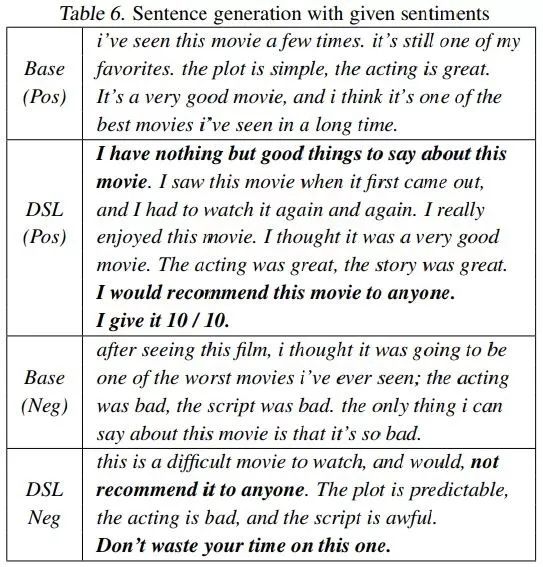 不过到了反向生成句子的时候,对偶监督学习模型展现出了强大的表现力,对简单短句的使用变少了,并且选用的单词、词语、句式表达出的情感更强烈、更具体。如下图