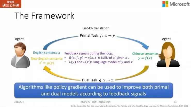 微软亚研主管研究员秦涛博士就曾带领团队分别在 NIPS 2016 和 ICML 2017 发表「对偶学习」(https://arxiv.org/abs/1611.00179)和「对偶监督学习」(https://arxiv.org/abs/1707.00415 )两篇论文,介绍了对偶学习在无监督学习和监督学习两种模式下的形式及表现。雷锋网硬创公开课也曾邀请到秦涛博士给大家做了前一篇 NIPS 论文的详细分享。