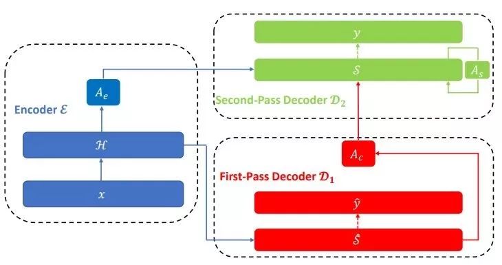 第一阶段的解码器 D1 把 H 作为输入,执行第一阶段的解码,得到 softmax 前的隐含状态 S^ 以及草稿句子 y^。第二阶段的解码器 D2 也是多层神经网络,但和 D1 有很大不同,它会把来自编码器 ε 和解码器 D1 的隐含状态都作为自己的输入。由于 D2 有来自 D1 解码出的隐含状态,所以 D2 的输出是依赖于 D1 生成的草稿句子 y^ 的。这样的做法可以从源语句中获得全局信息,在生成句子时也就有正确的上下文语境信息供使用。