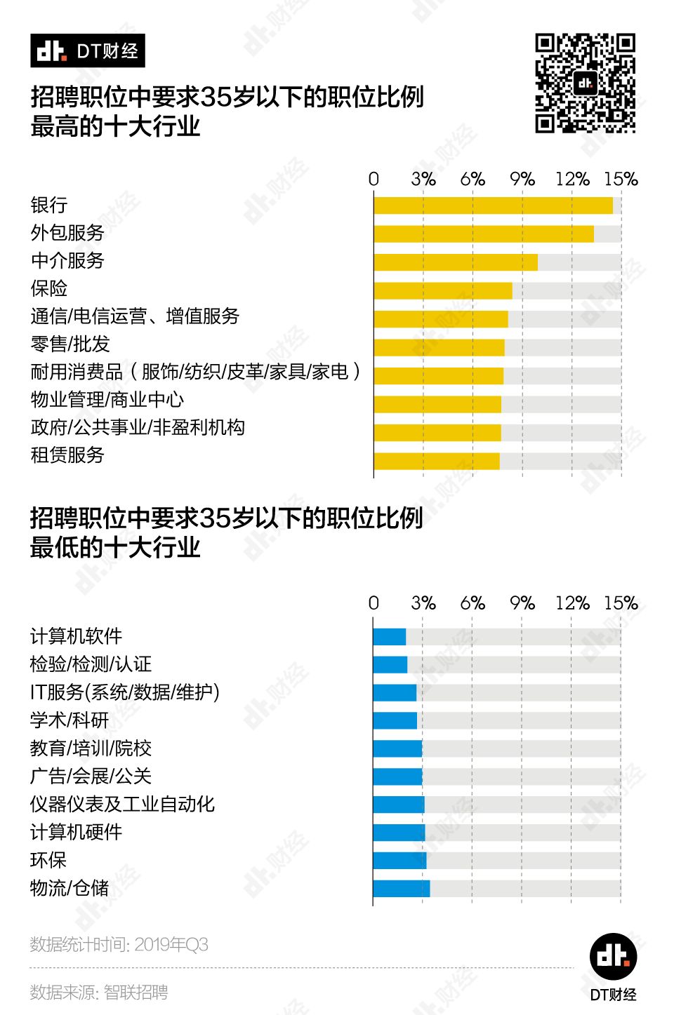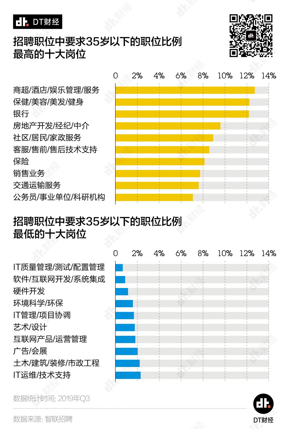 DT君整理了2019年招聘需求中要求35岁以下职位比例最高和最低的行业。