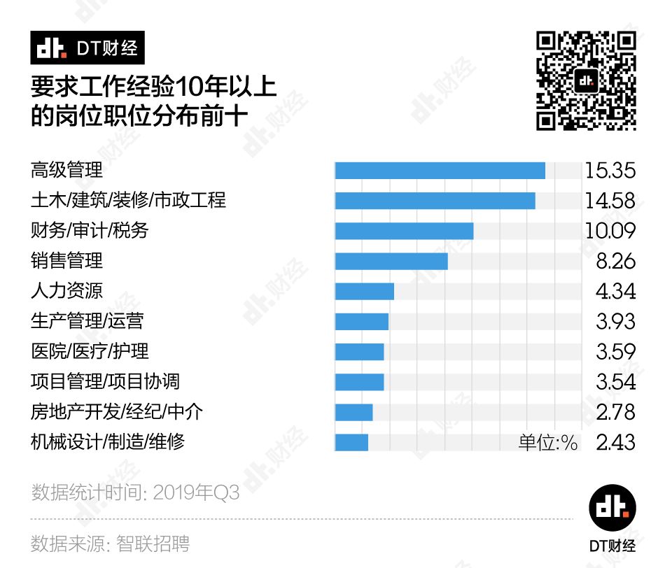 我们统计了各个职位要求工作经验10年以上的岗位数量,数量排名越靠前,则意味着这个职位对经验和阅历的需求度就更高,中年职场人也就相对更有优势。