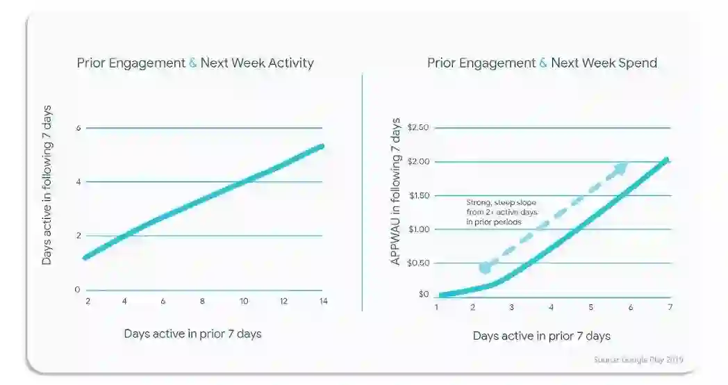 分析 Google Play 顶级应用的数据后,我们发现了与游戏相似的正相关关系: 用户的每周参与情况越好,未来收入和用户活跃程度越高。