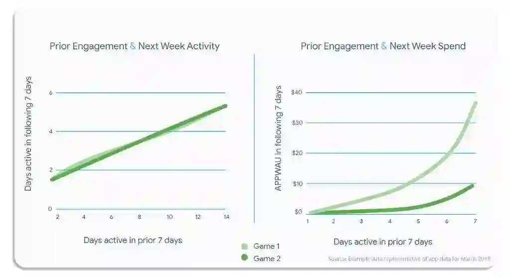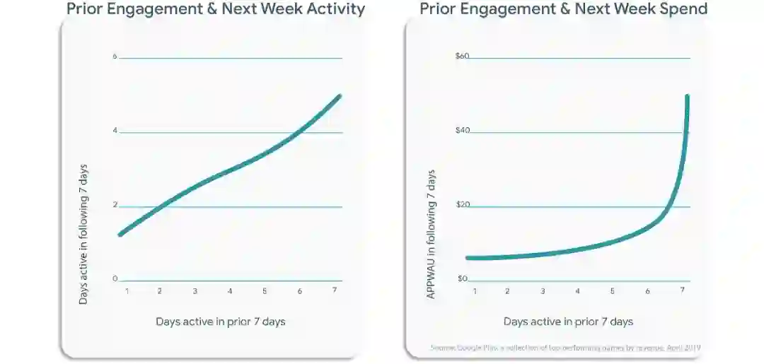 观察参与关系图后,我们发现在如果用户上一周有 6 天是活跃日,那么下一周的活跃期很有可能会达到 4 天。在消费购买方面,我们则发现如果用户上周的活跃天数不少于 2 天,强劲的参与体验将会促使他们在接下来 7 天进行消费。