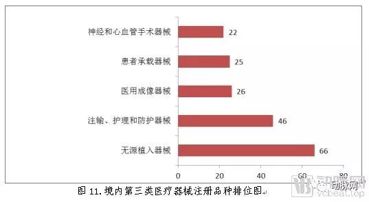 注册数量前五位的境内第三类医疗器械是:无源植入器械,注输、护理和防护器械,医用成像器械,患者承载器械,神经和心血管手术器械。