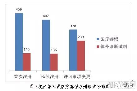 从注册形式看,首次注册599项,占全部境内第三类医疗器械注册数量的35.0%,延续注册543项,占全部境内第三类医疗器械注册数量的31.8%;许可事项变更注册567项,占全部境内第三类医疗器械注册数量的33.2%。注册形式分布情况见图7。