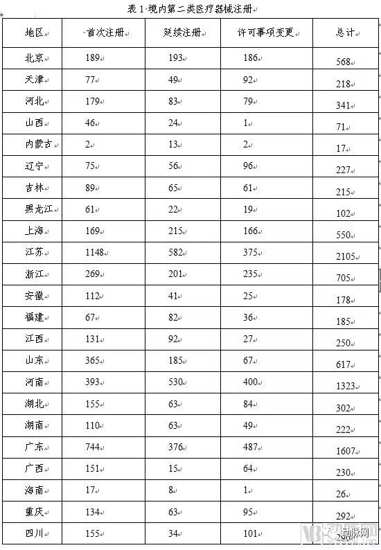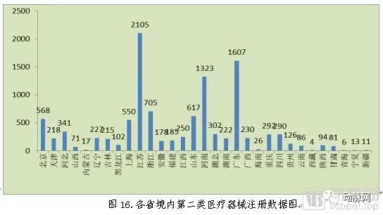 从注册情况看,江苏、广东、河南、浙江、山东、北京、上海七省(直辖市)注册的境内第二类医疗器械数量较多。第二类医疗器械注册具体数据见表1及图16。