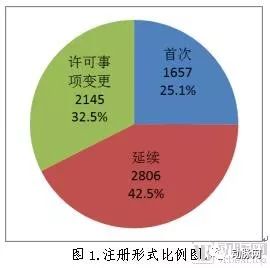 按注册形式区分,首次注册申请1657项,占全部医疗器械注册申请的25.1%;延续注册申请2806项,占全部医疗器械注册申请的42.5%;许可事项变更注册申请2145项,占全部医疗器械注册申请的32.5%。注册形式比例情况见图1。